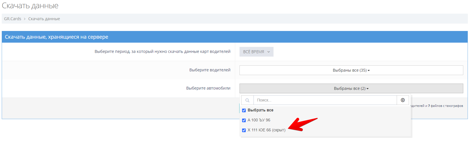 2. Если необходимо, выберите время, за которое вы хотите скачать данные. Выберите водителей и автомобили, по которым вы хотите данные. По умолчанию выбраны всё время, все водители и автомобили
