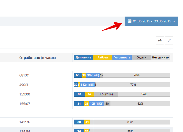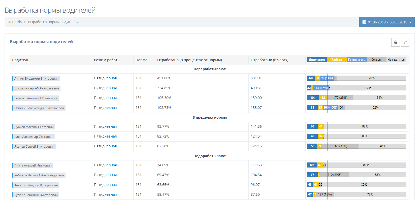 Используйте этот отчет, чтобы понять, кто из водителей выходит за пределы норм производственного календаря. График дает визуальные представление о выполнении нормы и о том, насколько эффективно используется рабочее время водителя. Чем больший процент управления автомобилем, тем более эффективен водитель. В расчете учитывается выбранный режим работы: пятидневная, шестидневная, суммированный учет. Переработки рассчитываются только для пятидневной - 8 часовой и шестидневной - 7 часовой рабочей недели.
