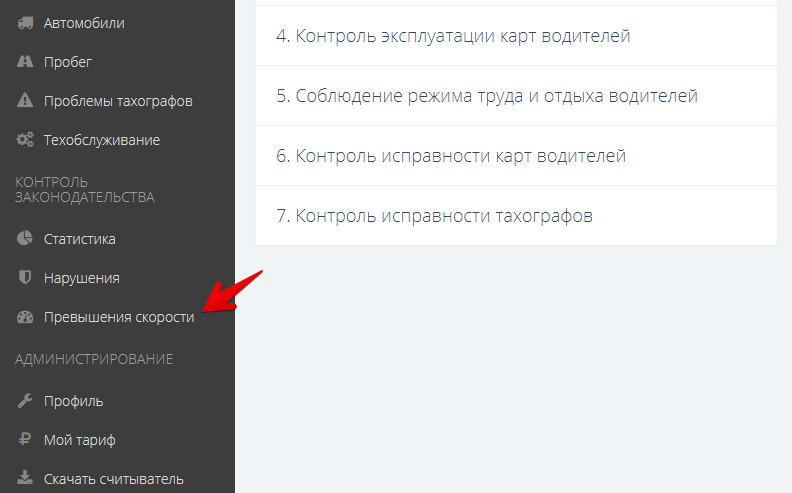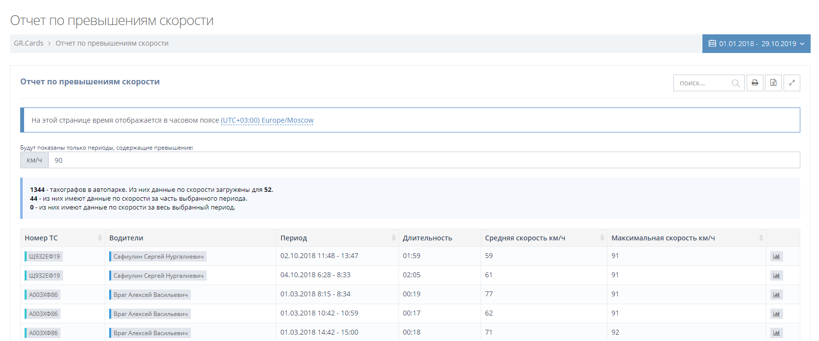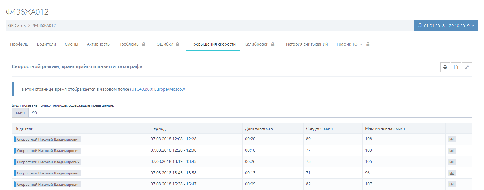 Чтобы просматривать отчет о превышениях скорости, необходимо выгрузить данные с внутренней памяти тахографа. О том, как этом сделать говориться в этой статье: Как загрузить в GR.CARDS данные с тахографа?