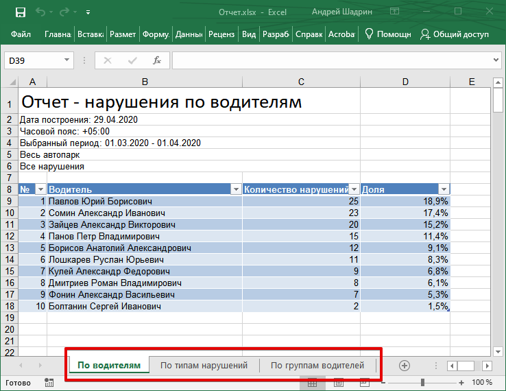 Также возможно выгрузить отчет в Excel файл. Кнопка выгрузки находятся справа от фильтров. В выгруженном файле 3 листа с данными: