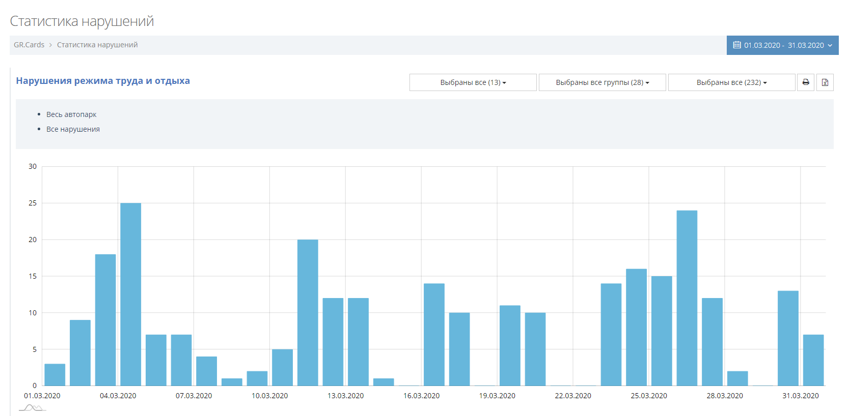 Перед работой с отчетом, рекомендуем выставить фильтры по типам нарушений, группам водителей, водителям, а так же выбрать диапазон дат в календаре.