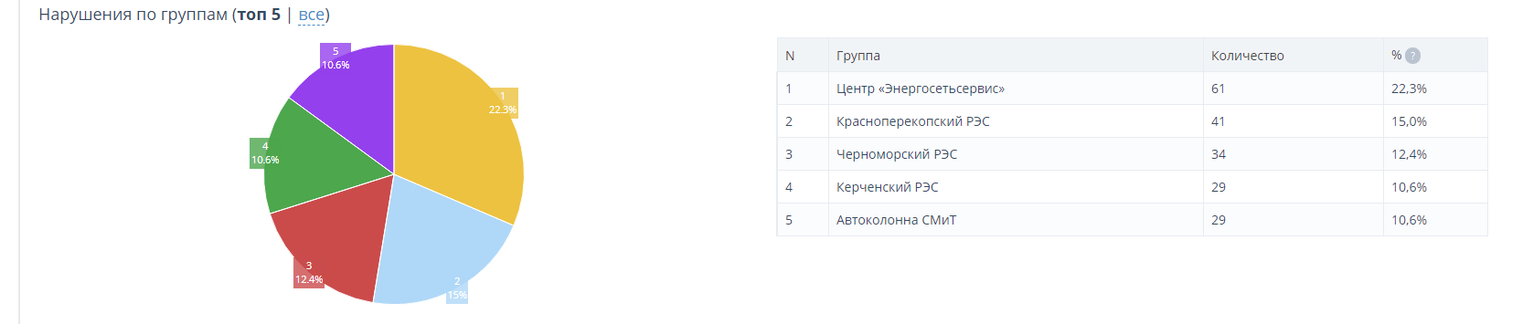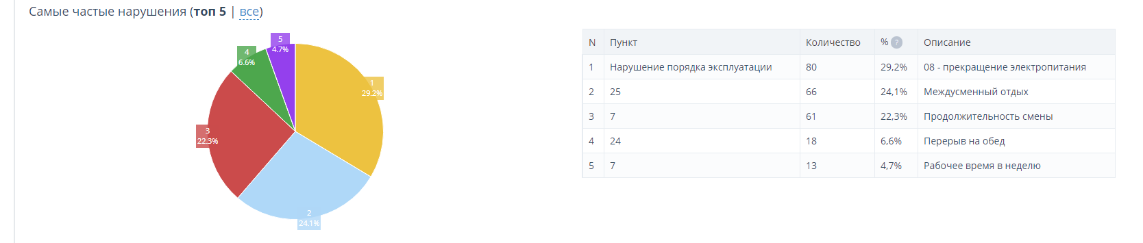 Эта диаграмма показывает самые частые нарушения по типам. Если какой-то тип нарушений преобладает, то это может указывать на постоянные ошибки в работе водителей. Исправление такой ошибки требует воздействия на весь коллектив. Если в фильтре выбраны не все типы нарушений, то диаграмма не доступна.