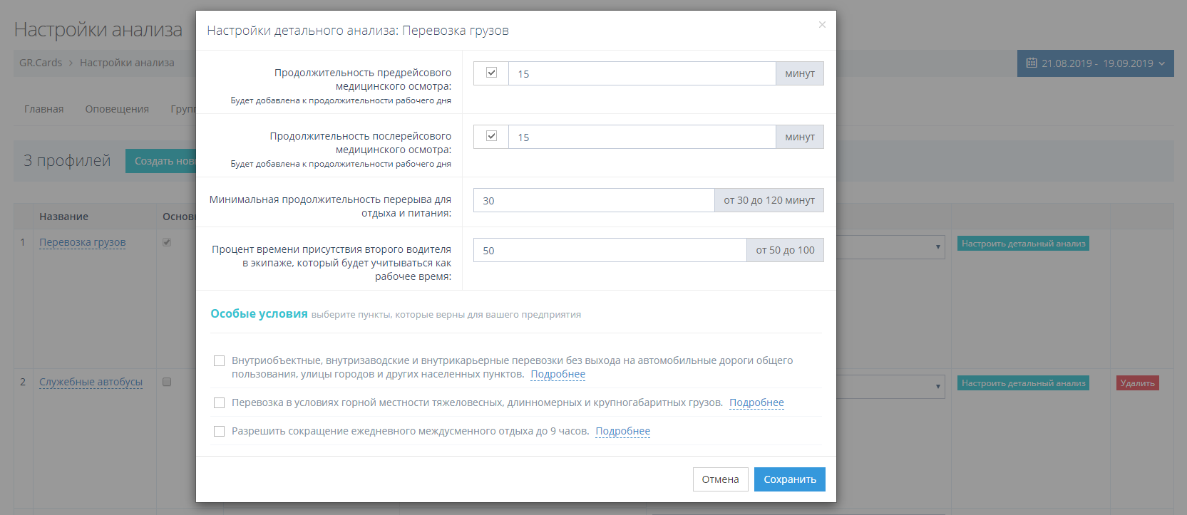 3. Тут вы можете выставить параметры в соответствии с графиком и спецификой работы водителей. Можно создать несколько профилей для анализа. Это необходимо, если водители работают по разным графикам, с разными типами перевозок или разной дальности перевозок.