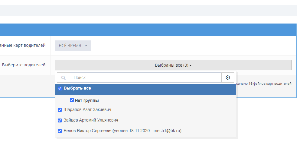 Всех уволенных водителей можно увидеть в разделе "Скачать данные". Напротив ФИО водителя будет указана дата увольнения, а также email пользователя, который произвел увольнение.