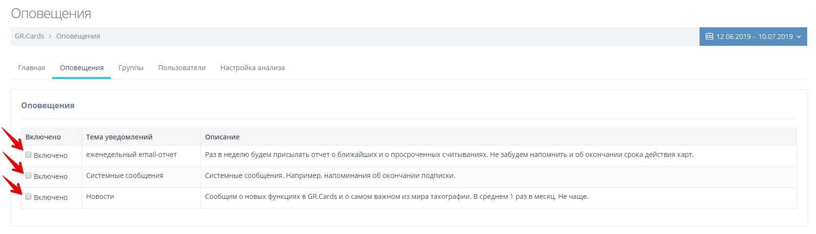 3. Поставьте галочки напротив необходимых оповещений.