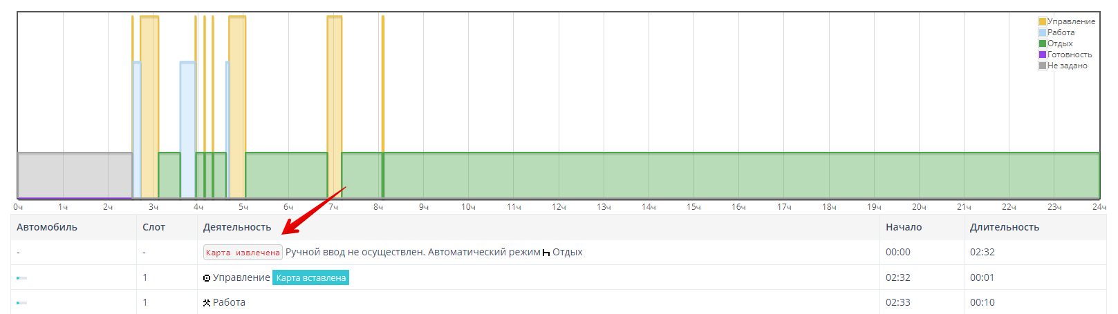 Режим «не задано» возникает, когда водитель не произвел ручной ввод данных при вставке карты в тахограф. Этот промежуток времени засчитывается как отдых.