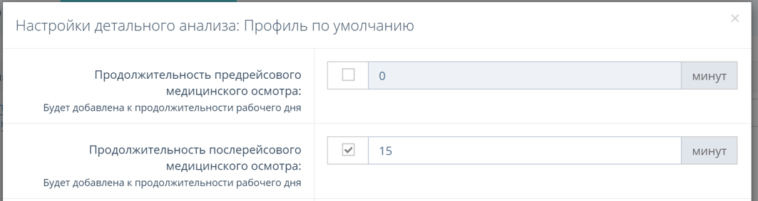 Поскольку медосмотр должен входить в рабочее время, теперь мы в обязательном порядке добавляем его к смене водителя. Отключить или задать продолжительность медицинского осмотра можно в настройках анализа.