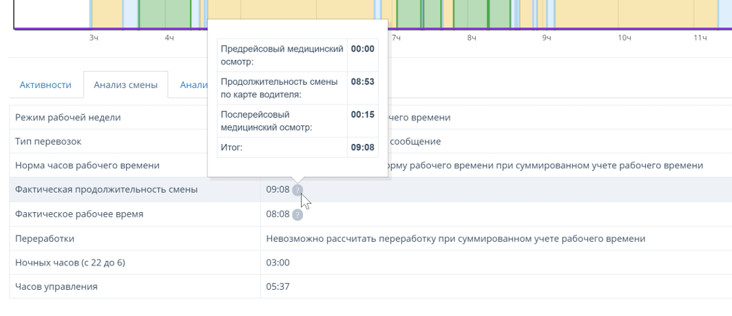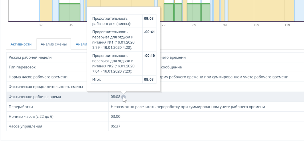 Чтобы не запутаться, мы добавили таблицу расчета продолжительности смены и продолжительности рабочего времени. Найти можно на вкладке «анализ смены» в просмотре смены водителя.