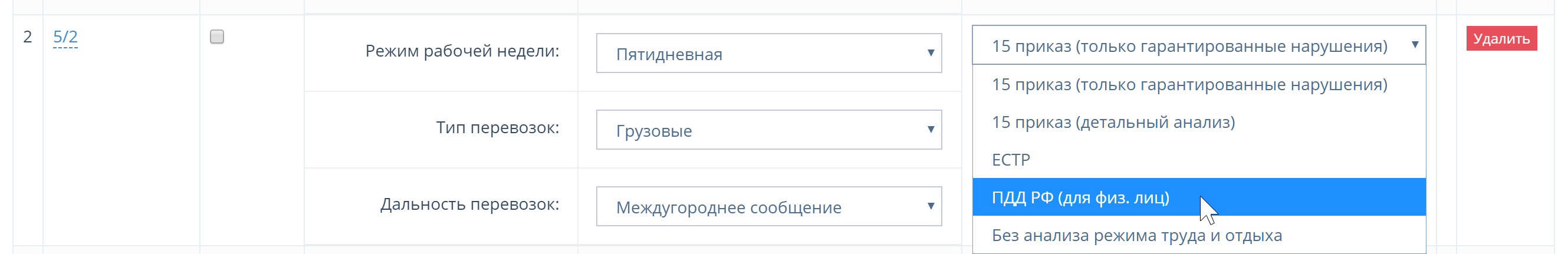 В связи с этим, мы добавили возможность проверить водителя на нарушения режима труда и отдыха по ПДД РФ. Для этого в профиле анализа выберите "ПДД РФ (для физ.лиц)"