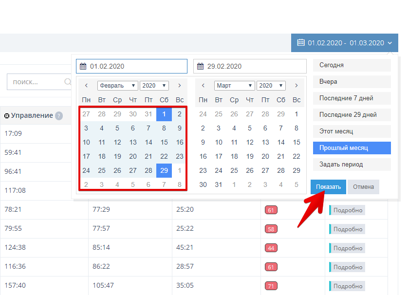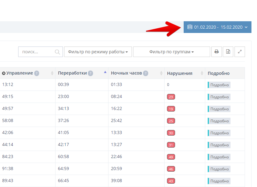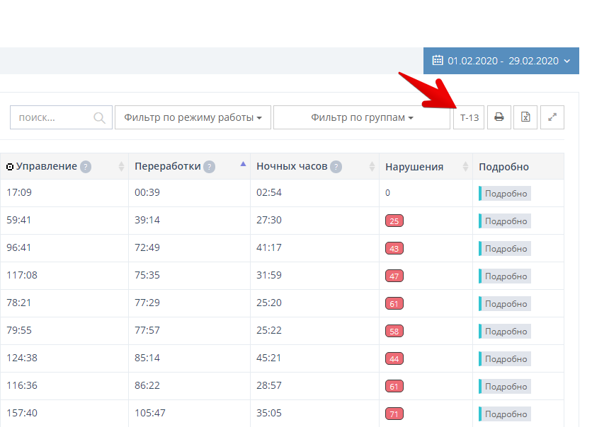 Во вкладке "Переработки" отображается количество часов сверх нормы рабочего времени за смену и всего за месяц.