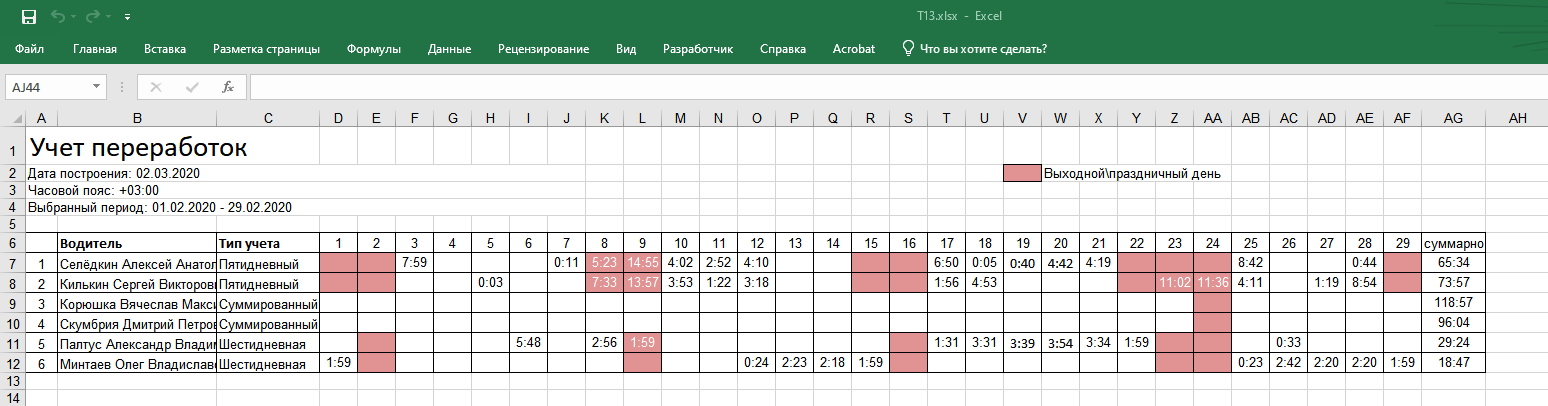 Во вкладке "Рабочее время" отображается отработанное время за каждый день месяца и суммарно за месяц.