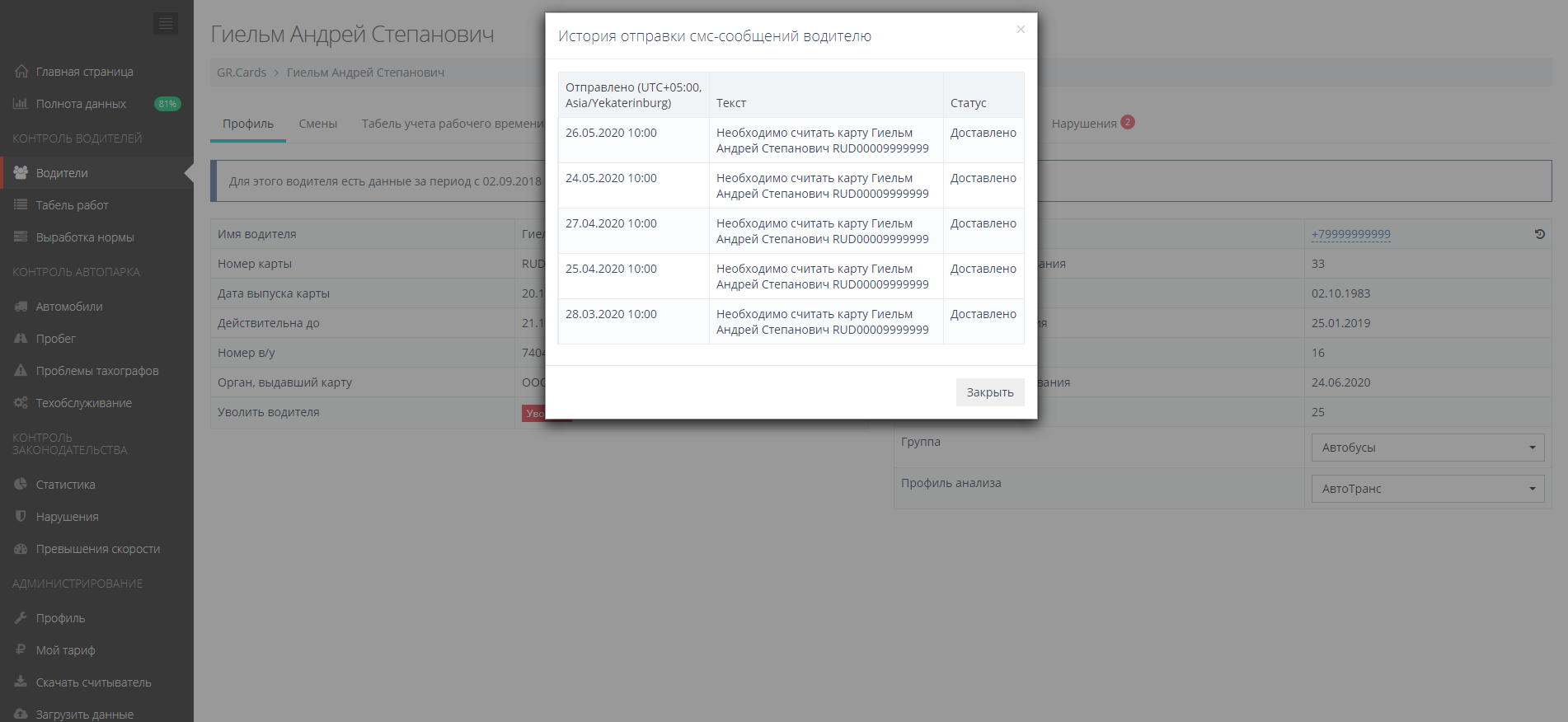 Вы можете просмотреть историю и статусы всех СМС оповещений, которые были направлены вашим водителям. Это поможет вам узнать, было ли направленно/доставлено СМС, а также вычислить водителей, которые игнорируют оповещения.