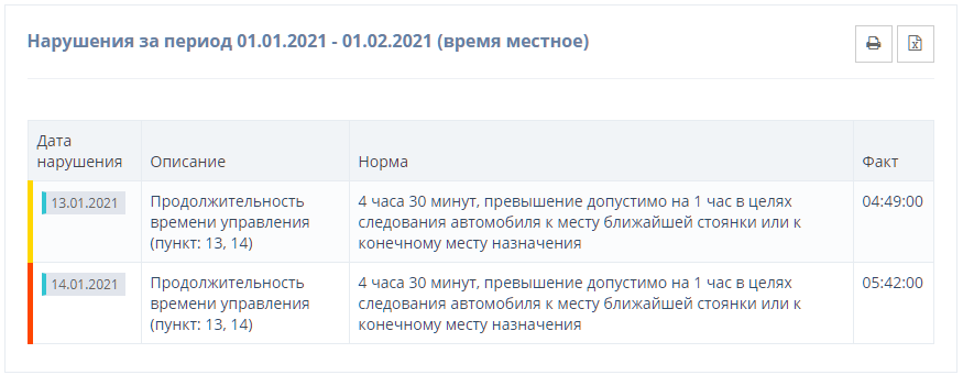 Для примера разберем следующий случай. Водитель управлял автомобилем без специального перерыва 4 часа 49 минут. В этом случае мы покажем предупреждение, так как (пункт 14) "превышение времени управления автомобилем [...] допускается, но не более чем на 1 час, в целях следования автомобиля к месту ближайшей стоянки для отдыха или к конечному месту назначения." позволяет не считать это превышение нарушением.