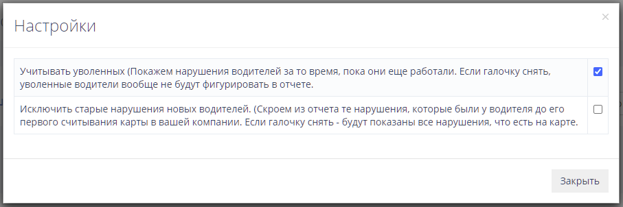 При высокой текучке водителей наши пользователи часто сталкивались с ситуацией, когда в статистике не учитывалась работа уволенного водителя, или наоборот, в статистике появлялись данные с карты водителя за то время, когда он еще не работал на предприятии. Специально для решения этих проблем, мы добавили настройки для отчета по статистике нарушений:
