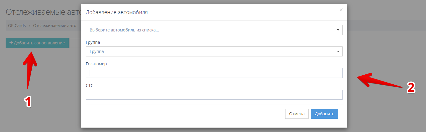 - По нажатию кнопки "Добавить сопоставление" заведите СТС и гос. номера всех транспортных средств, по которым вы хотите отслеживать штрафы. Для удобства можно разделить транспортные средства на группы.