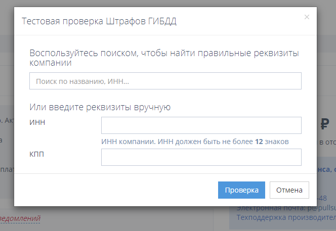 - Введите ИНН/КПП вашей организации (если они небыли заданы ранее) по которым будет происходить поиск штрафов. Если у вашей компании более одного КПП, то введите их через запятую.
