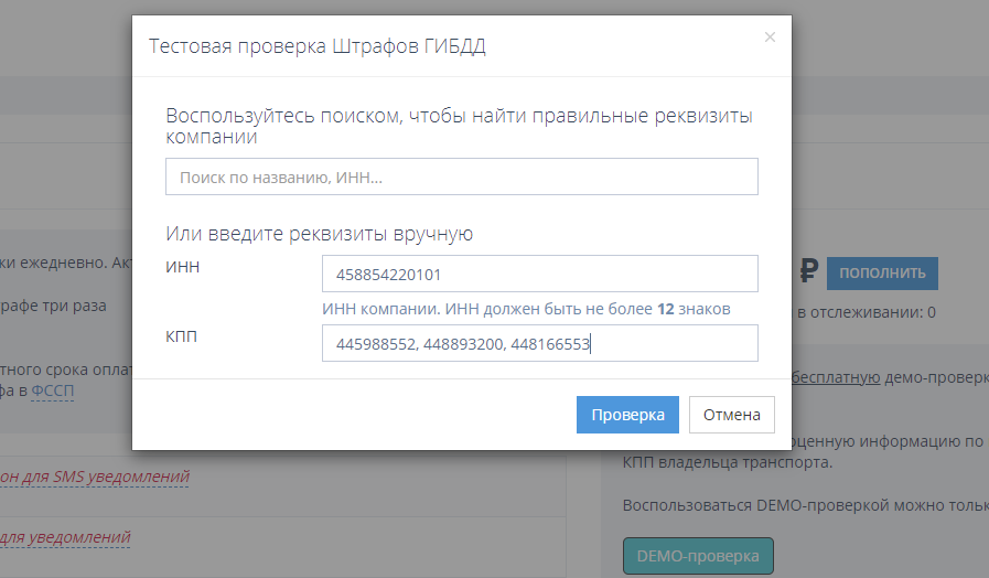 Теперь для проверки штрафов по ИНН/КПП можно использовать несколько значений КПП. Для этого при первом использовании раздела "Штрафы" введите КПП через запятую, как показано на скриншоте ниже. Если же вы уже пользуетесь модулем "Штрафы" и вам необходимо добавить дополнительные КПП для проверки штрафов по ним, то обратитесь в нашу службу техподдержки support@georoute.ru.