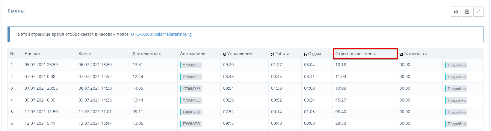 В списке смен водителей добавили столбец "Отдых после смены". В нем отображается фактическое значение между окончанием прошлой смены и началом следующей смены.
