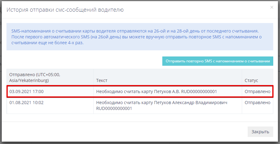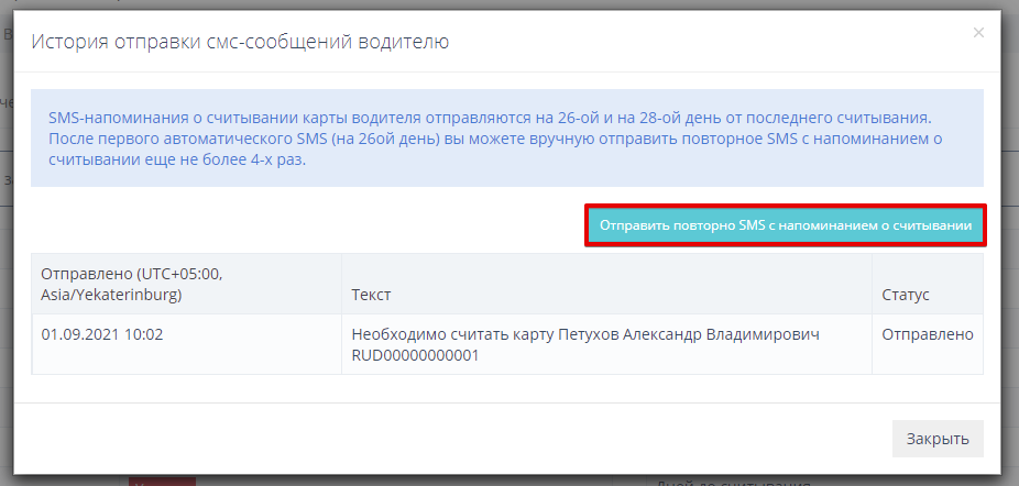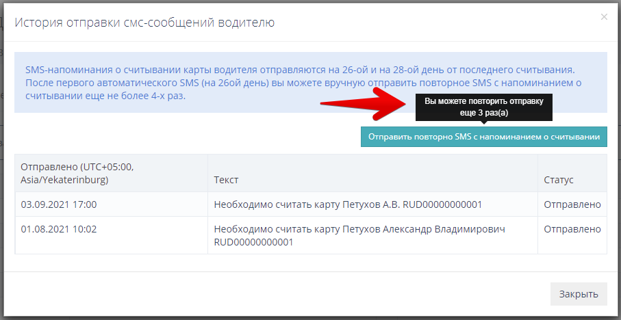 Она нужна, чтобы отправить SMS с напоминанием о считывании вручную. Это будет полезно в тех случаях, если водитель предыдущие SMS с напоминаниями о считывании карты и все еще не считал карту.