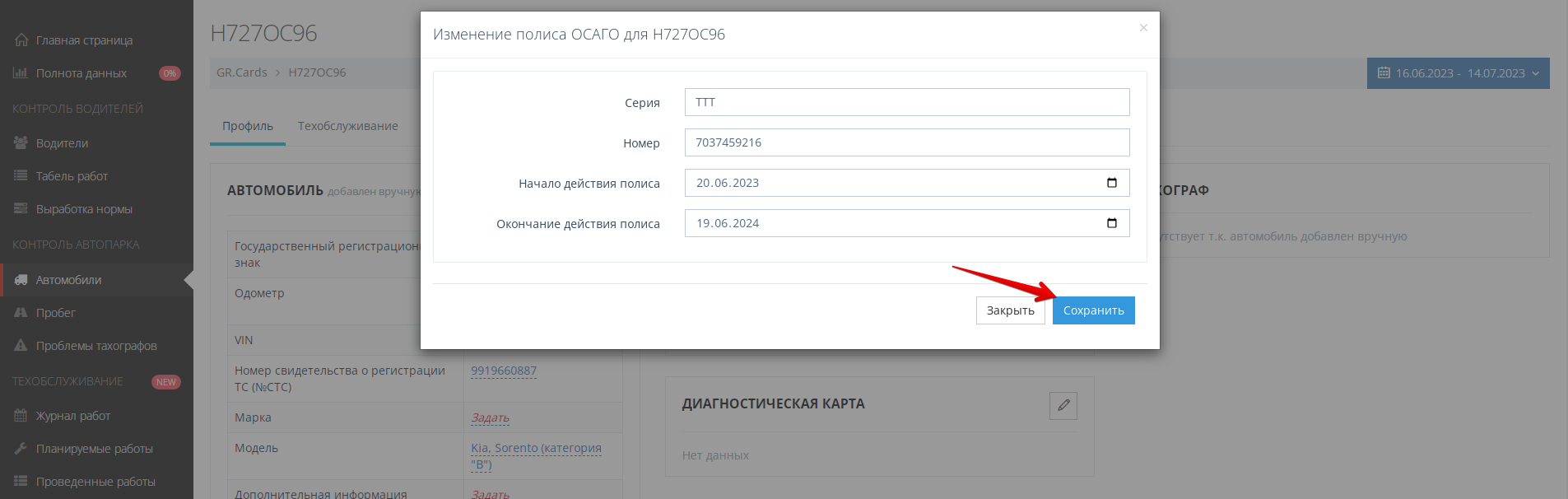 3. В открывшемся окне внесите данные полиса ОСАГО в соответствующие поля и нажмите «Сохранить».