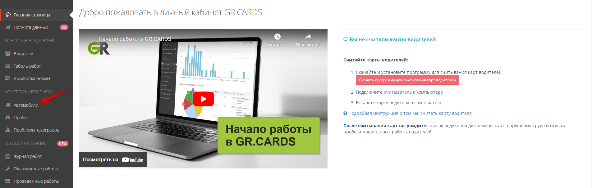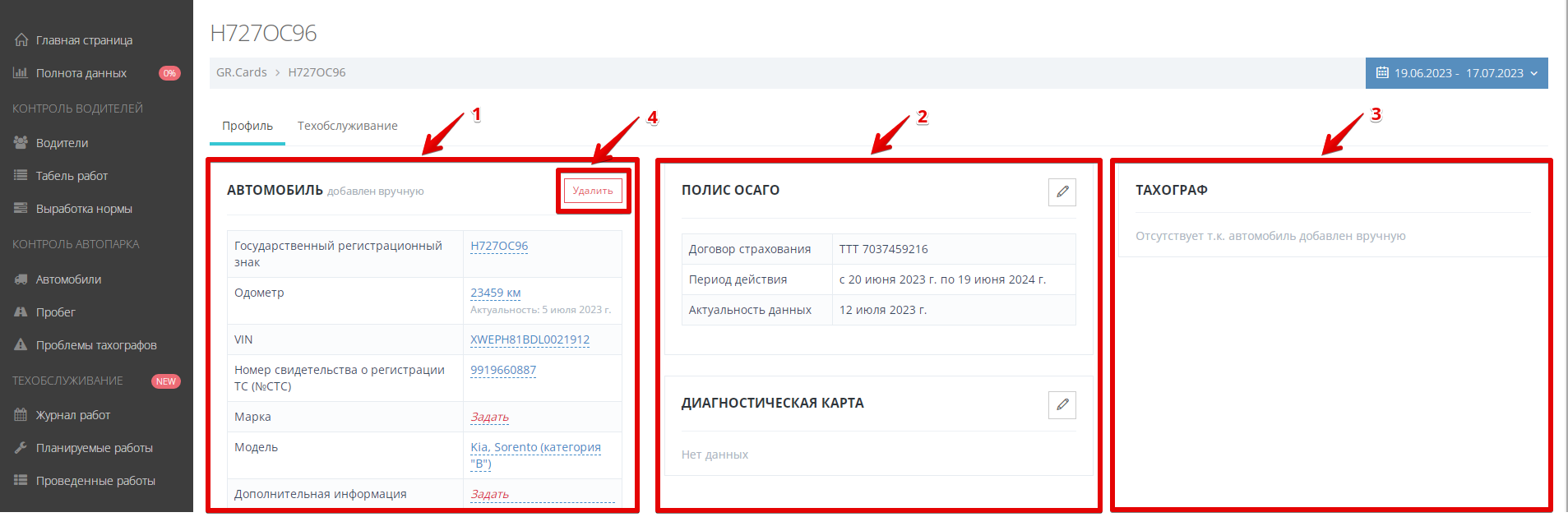 Данные по тахографу могут отображаться только для автомобилей, оборудованных ими и подгружаются в этот раздел автоматически (3). Подробно процедура описана здесь: Как загрузить в GR.CARDS данные с тахографа?