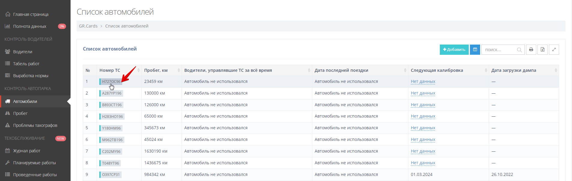 3. Нажмите на гос. номер автомобиля, чтобы войти в его карточку.