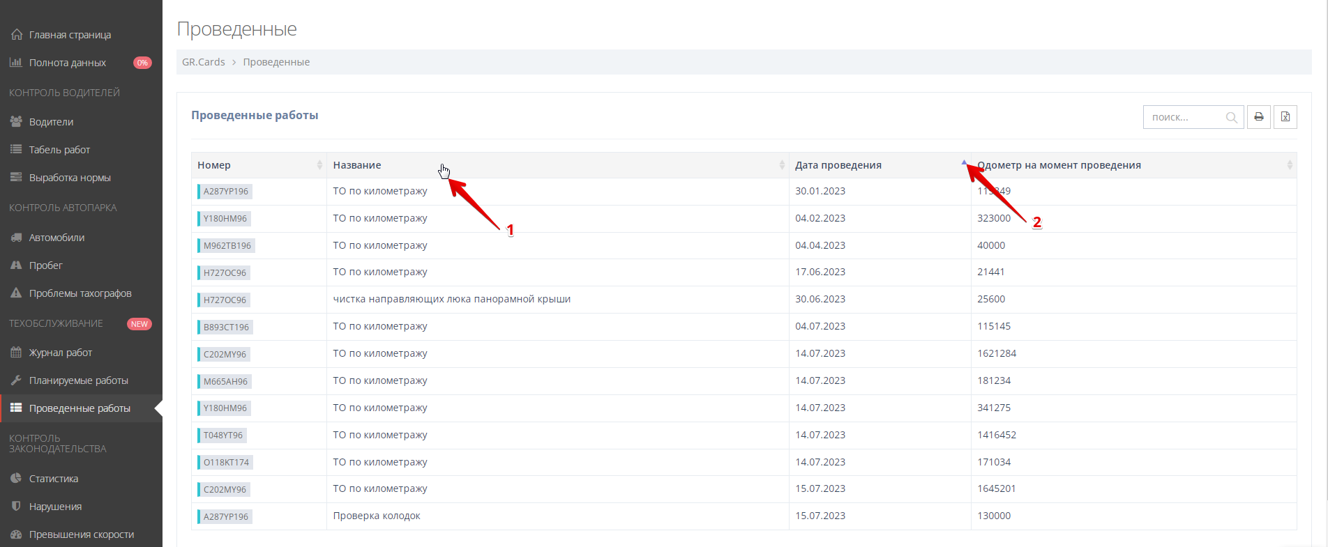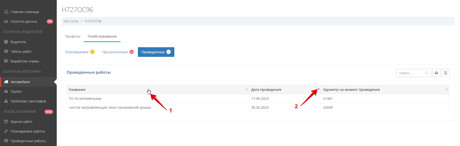 2. Найдите в списке нужный автомобиль пролистав таблицу (1). Либо через форму поиска (2). Помните, что гос. номер может быть указан русскими буквами или латиницей.